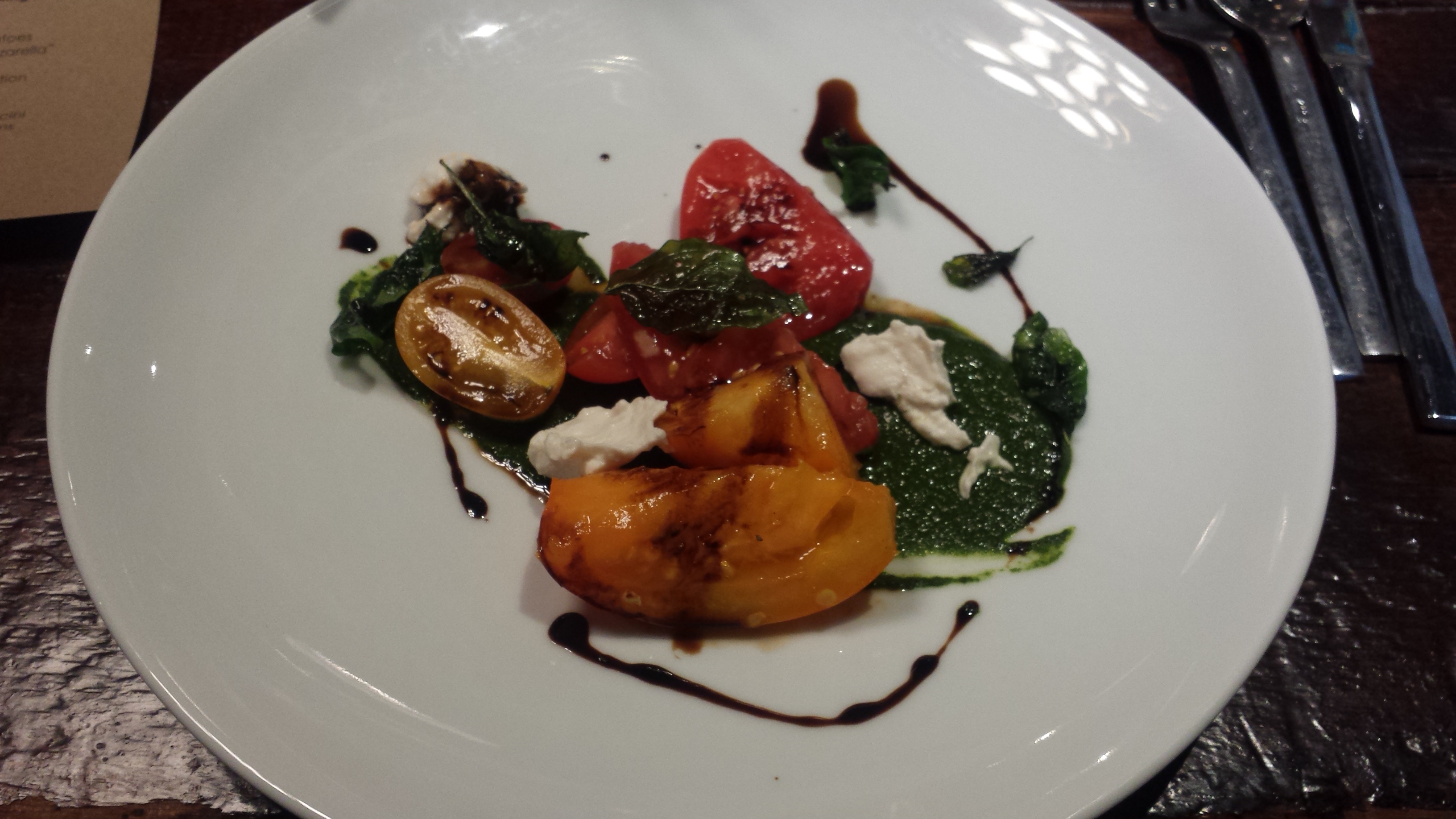 Dinner began with an amuse bouche, a savory and creamy potato and leak soup with chive. Warm ,and thick, this fooled vegetarian and vegan diners into wanting to ask the question: is there milk in that?!? Each sip offered a comfortable, yet layered flavor and a very well blended texture. Hardly the traditional rustic experience of a more traditional Potato and Leak Stew, and surprising to be served both a warm amuse, and a warm soup in sipping service.