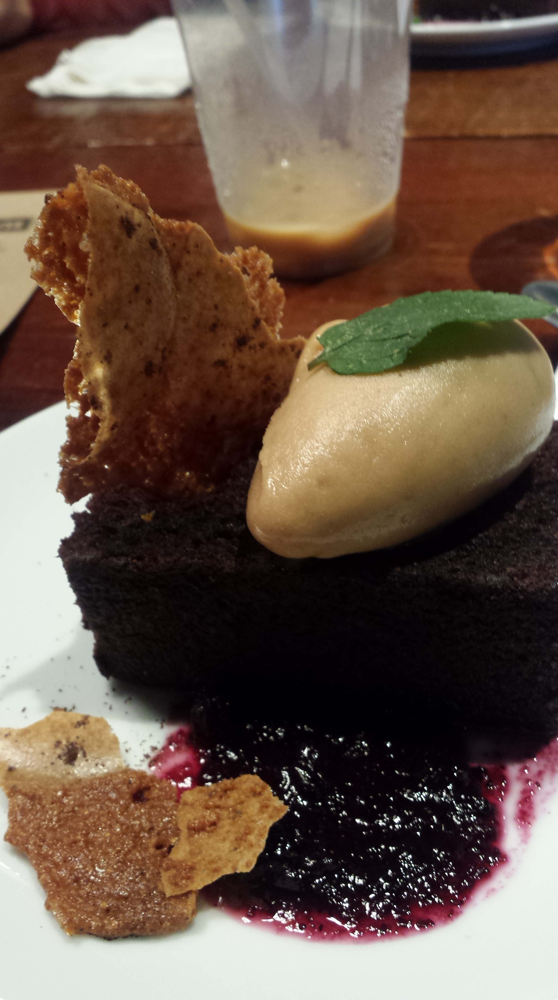 And lastly, the dessert. For many vegetarians and meat-eaters, it is vegan desserts that truly win them over, and in this Core did not disappoint. The chocolate cake came in an ample portion, adorned with hazelnut gelato, fresh mint, and espresso macaron. The wafer-like macaron stole the show, a light and airy but resilient texture change to activate the rich cake. Its hard to go wrong with flavor combinations of coffee, hazelnut and chocolate, and all of which were presented on a slightly slap-dash pond of berry compote. The introduction of a fruit into the mix could have been a refreshing alternative to the richness of the other stars, but instead offered a similarly rich, candied, syrup to alternate with the hazelnut gelato– not a detractor but didn’t add much other than another element, which could have been presented in a more visually pleasing manner.