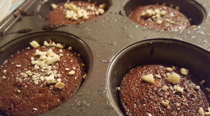 Mix together, and pour between 1/4 and 1/3 of a cup into your tins or liners,and bake for 25-28 minutes, depending on how soft you like your centers. Really let them cool before digging in, I know, the struggle is real.