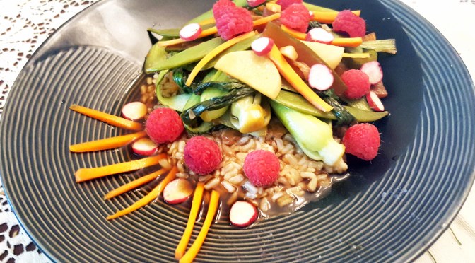 Once it is nice and juicy, add your cooked vegetables on top of the rice, and decorate with the carrot sticks, radish discs, and raspberries.