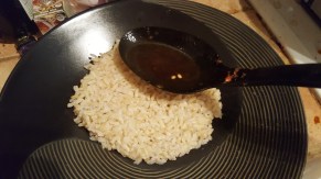 Heat a large sautee pan or wok until a droplet of water turns into a perfect sphere upon contact, then add 2 Tbs of oil and 1 Tbs of soy sauce, and stand back so the splatter doesn’t catch you.