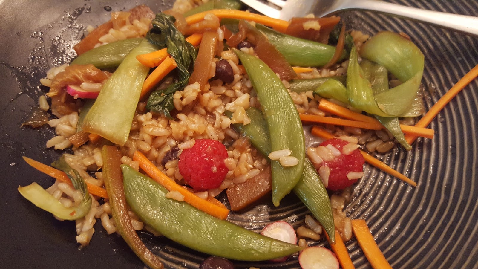 Snap peas and Choi can both be enjoyed raw, but in this salad we will sauté them to bring in a ton of flavor and a variety of textures. Some of the ingredients will be raw, like the raspberries, carrots and radishes, and you can serve this dish hot from the wok or chilled from your fridge.