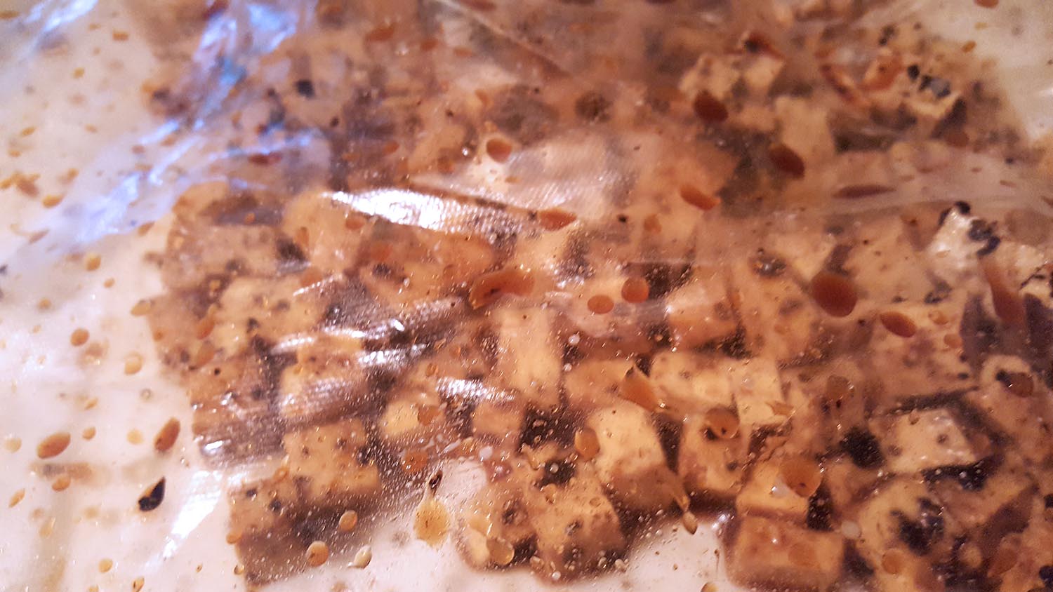 Then you’re going to toss the tofu in the marinade bag and let it sit until the oven has reached the temperature you want, turning the bag over every other minute to ensure even coating.