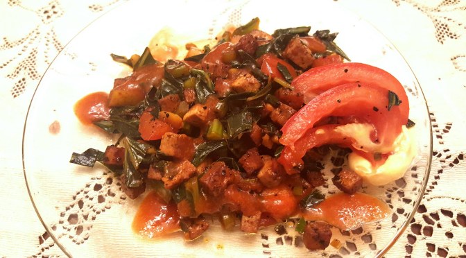 Something about Collard Greens always puts me in the mood for southern cooking…and while soul food and vegan cooking may not be the most intuitive combination, I assure you it can be delicious! For this dish we will make a tasty, smoky, meaty baked tofu that we add to our equally smoky and also garlicky and a little feisty collard greens.